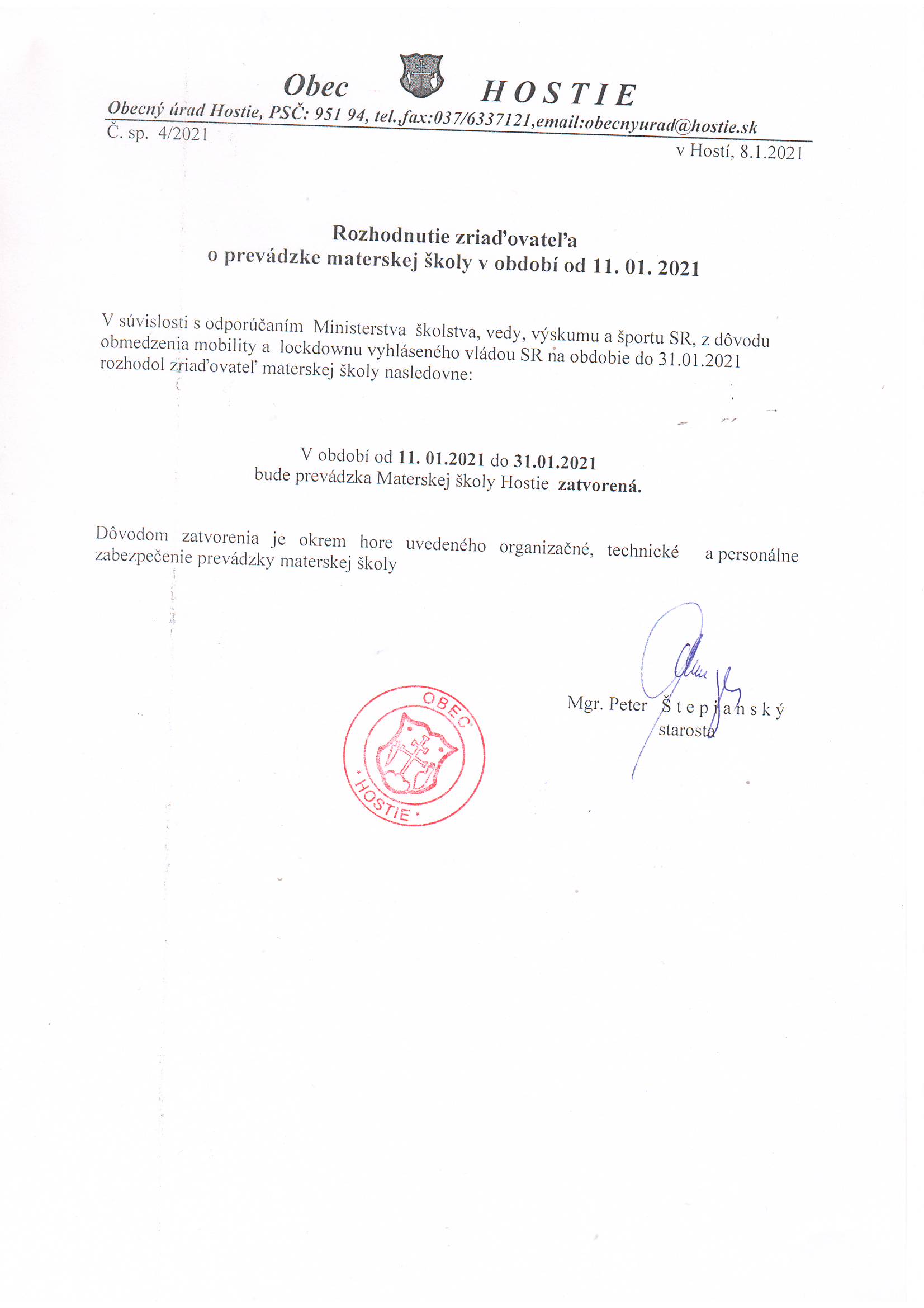 Rozhodnutie o uzatvorení MŠ Hostie od 11.1.2021 do 31.1.2021.
