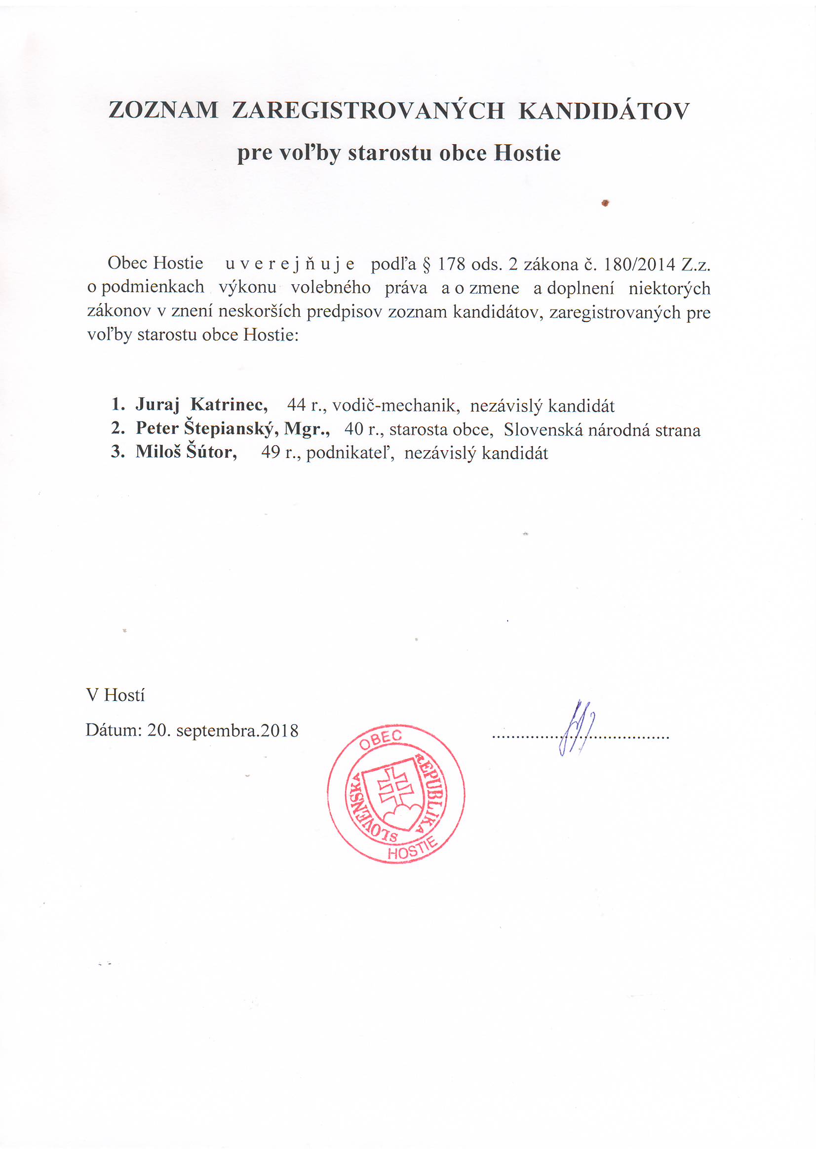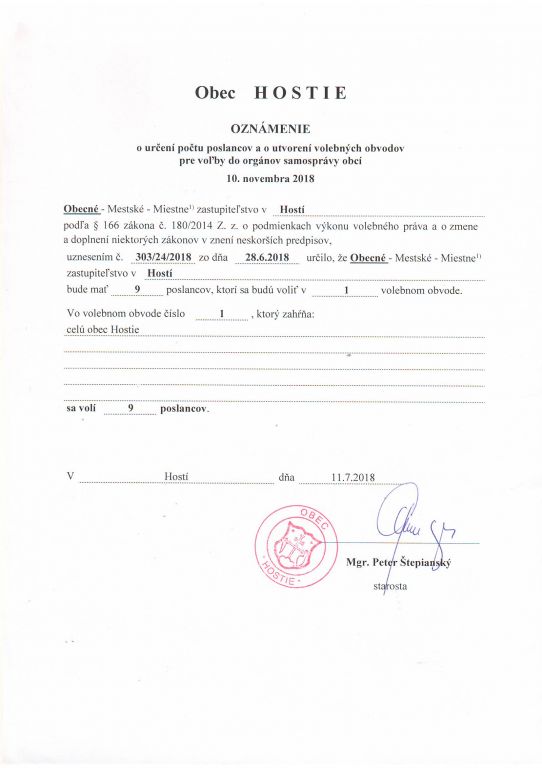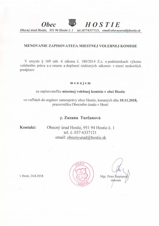 E-mailová adresa, na ktorú môžete zasielať oznámenia o delegovaní člena a náhradníka do miestnej volebnej komisie a okrskovej volebnej komisie pre voľby do orgánov samosprávy Obce Hostie, dňa 10.11.2018, je: obecnyurad@hostie.sk